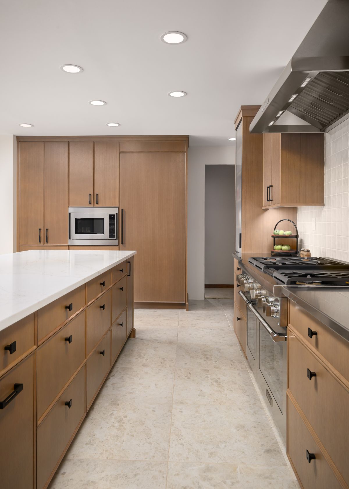 This warm yet modern kitchen blends organic textures with refined elegance. The two-tone cabinetry—rich black on the island and natural rift cut white oak perimeter cabinets—creates a stunning contrast while maintaining a cozy, inviting feel. The quartz countertops add a sleek, durable surface, complemented by a bold custom range hood that anchors the space.