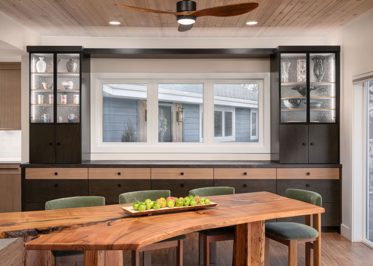 This full kitchen remodel blends clean modern lines with natural warmth. Rift cut white oak cabinetry in a soft cashmere finish is paired with flat black hardware for subtle contrast and a timeless look. Designed for frequent entertaining, the layout offers generous prep space and an inviting flow between the kitchen and dining area. A dedicated coffee station was a must, thoughtfully created to showcase the homeowners’ coffee mug collection. Adding a personal touch, the husband handcrafted the live edge dining table, grounding the space with character and making it a true gathering place for family and friends.